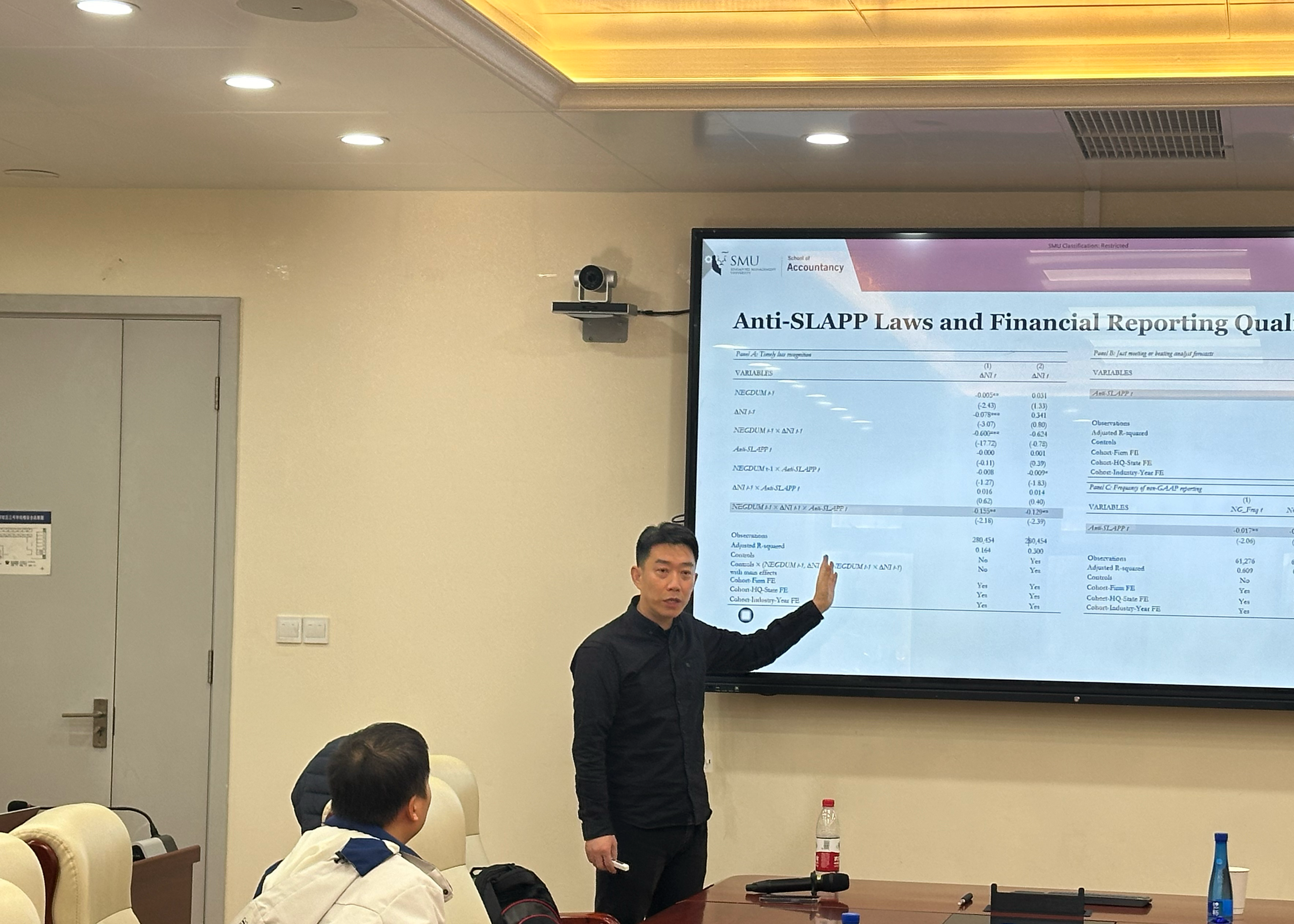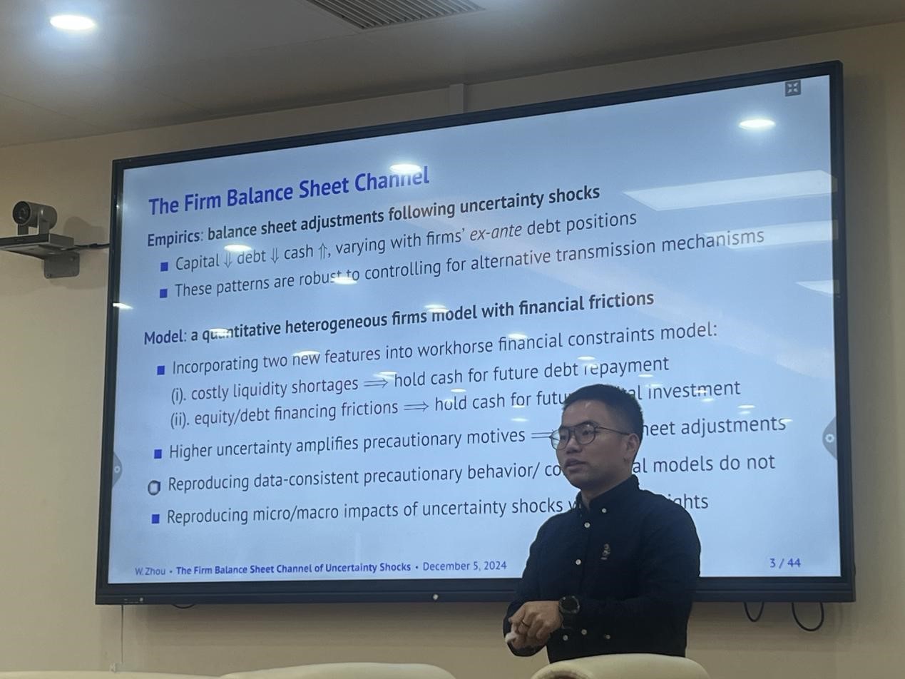 2024年12月5日上午,鸿儒全球金融治理系列讲座第二期在中央财经大学沙河校区金融学院3号楼127教室顺利举行。密歇根州立大学经济学助理教授周文涛以“The Firm Balance Sheet Channel of Uncertainty Shocks”为题展开精彩报告。
