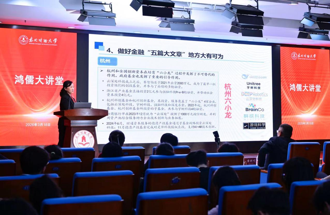 2026年3月18日下午,由鸿儒金融教育基金会与东北财经大学金融学院合作设立的鸿儒奖学金颁奖仪式暨第八期鸿儒大讲堂在东北财经大学图书馆学术报告厅成功举办。鸿儒金融教育基金会理事长、国家级人才称号获得者、中央财经大学国际金融研究中心主任张礼卿教授,十四届全国政协经济委员会委员李瑶博士,东北财经大学党委常委、副校长孙武军,鸿儒金融教育基金会副秘书长段玉平及学术委员会委员邢天才教授出席仪式,李瑶博士应邀作专题报告。东北财经大学金融学院领导班子及师生代表160余人参加活动。活动由金融学院院长宗计川主持。
