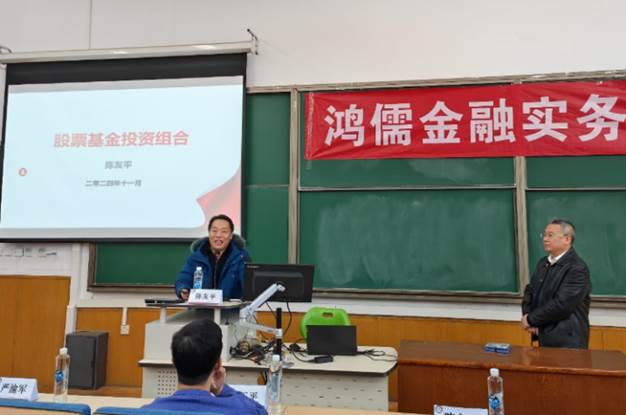 11月28日,2023 - 2024学年秋季学期“鸿儒金融实务系列讲座”第四讲在对外经济贸易大学博学楼301教室顺利举办。本次讲座主题为“股票基金投资组合”,由正高级经济师、九三学社上海金融委员会专家委员会委员、中国银行业协会私人银行与财富管理专家库专家、特邀讲师陈友平先生担任主讲嘉宾,对外经济贸易大学中国金融学院严渝军副教授主持。对外经济贸易大学中国金融学院各年级博士研究生、2024级硕士研究生、鸿儒实验班本科生等200余人参加讲座。