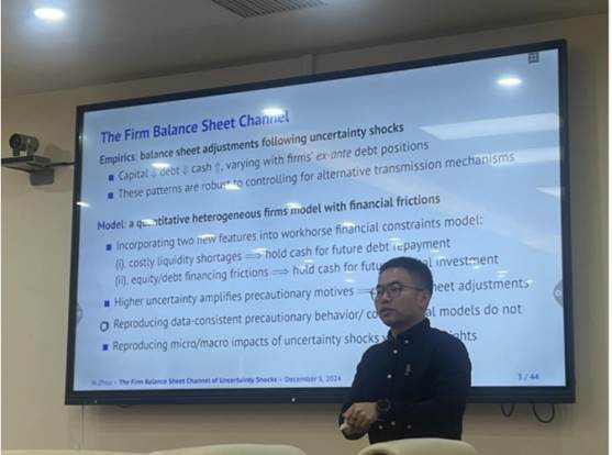 12月5日,鸿儒全球金融治理系列讲座第二期在中央财经大学沙河校区金融学院3号楼127教室顺利举办。密歇根州立大学经济学助理教授周文涛以“The Firm Balance Sheet Channel of Uncertainty Shocks”为主题,进行了一场精彩的报告。本次讲座由中央财经大学金融学院杜涣程副教授主持。
