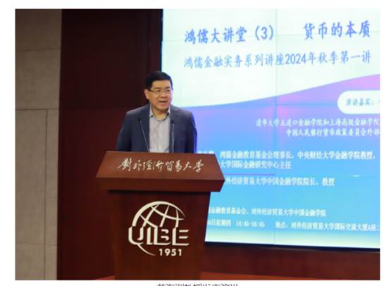 9月26日,鸿儒大讲堂第三期暨2023 - 2024学年秋季学期“鸿儒金融实务系列讲座”第一讲在对外经济贸易大学国际交流大厦二层报告厅圆满举办。本期鸿儒大讲堂的主讲嘉宾为清华大学五道口金融学院和上海高级金融学院特聘教授、中国人民银行货币政策委员会外部专家委员、中国宏观经济学会副会长黄海洲教授。鸿儒金融教育基金会理事长张礼卿教授、秘书长徐霄,对外经济贸易大学中国金融学院院长王天一,以及校内外师生和学者400余人参与了本次讲座。黄海洲教授分享了与其合作者的最新研究成果。张礼卿理事长代表鸿儒金融教育基金会向黄海洲教授赠送了专门订制的“鸿儒大讲堂”纪念盘。